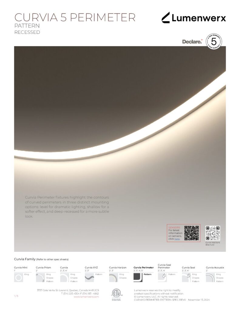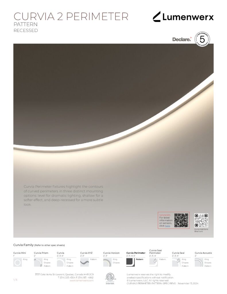 Curvia Perimeter fixtures highlight the contours of curved perimeters in three distinct mounting options: 1) level, for dramatic lighting; 2) shallow, for a softer effect; and 3) deep-recessed, for a more subtle look.