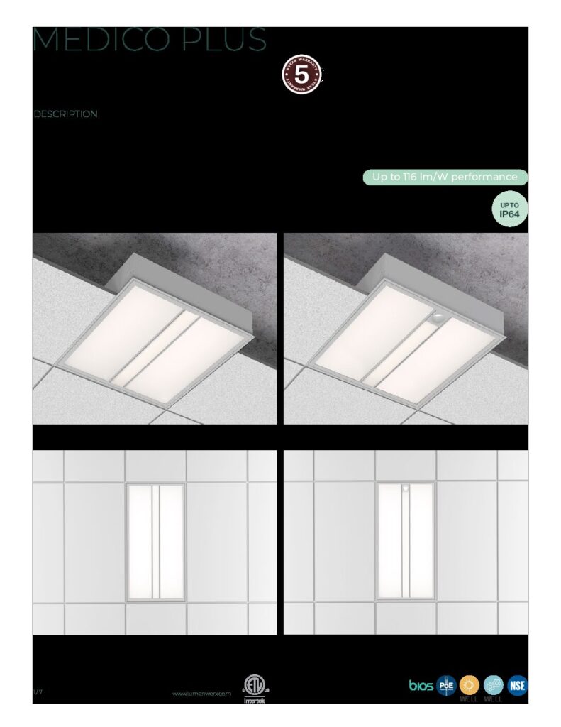 Medico was designed to address both patient and staff needs in healthcare facilities. Multifunctional and powerful, the luminaire family delivers low glare illumination without light trespass in multi-patient room settings. Medico Plus offers Exam, Ambient, and Reading modes.