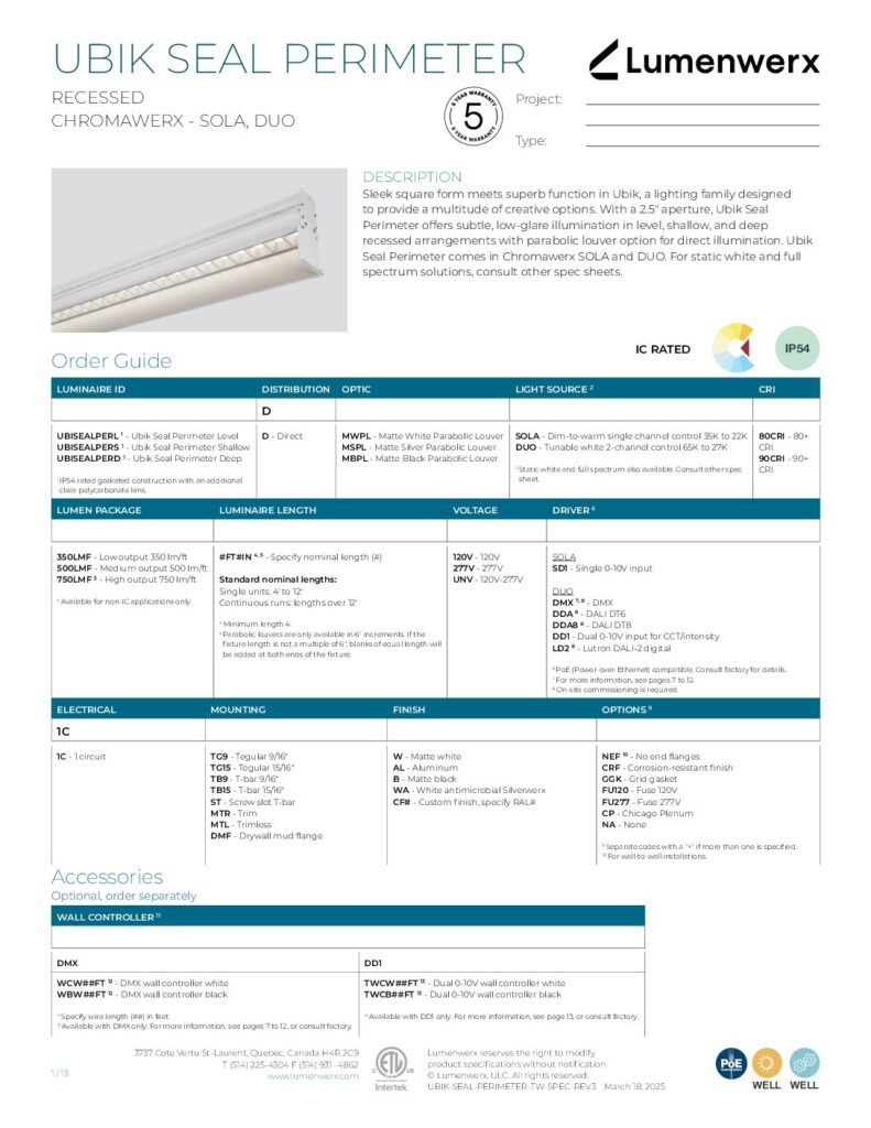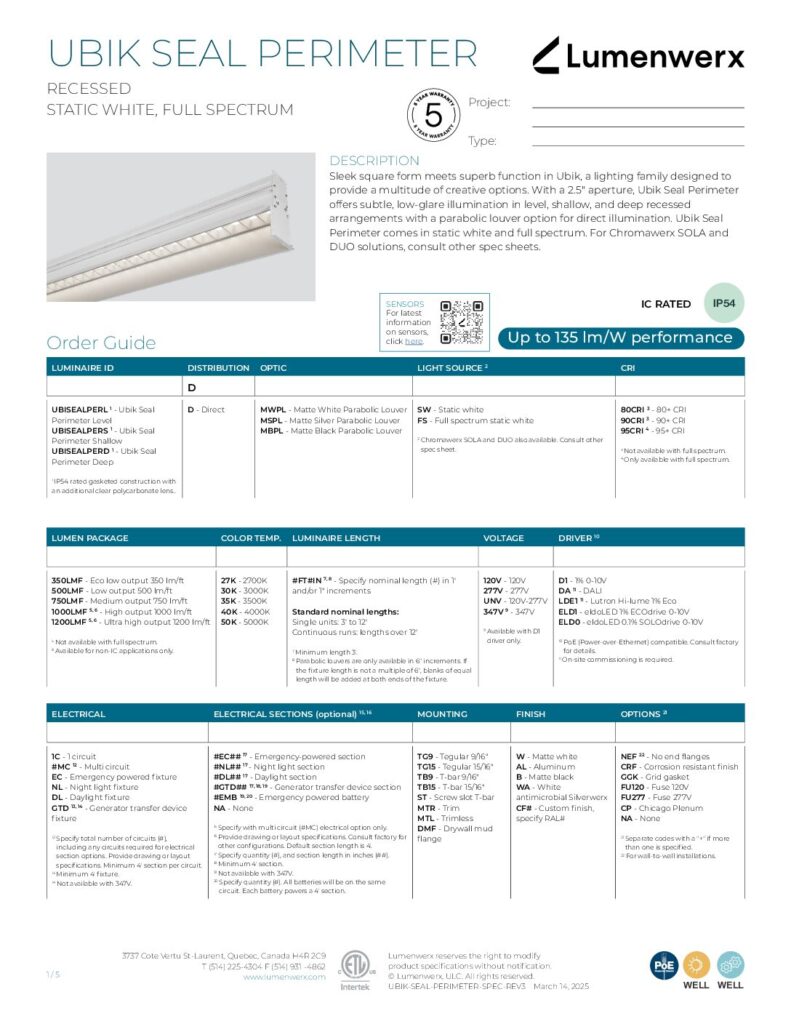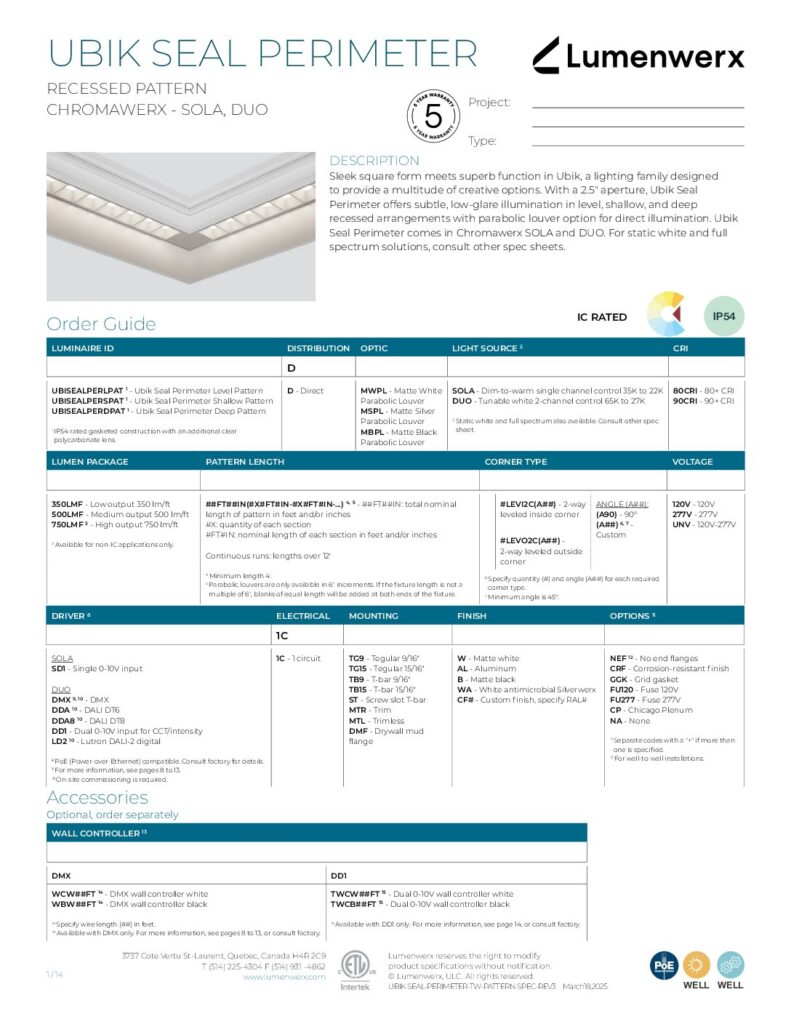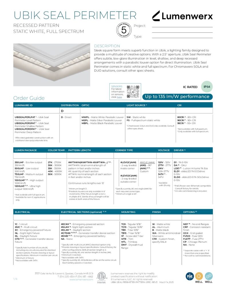 Ubik Seal Perimeter offers subtle, low-glare illumination in leveled, shallow, and deep recessed arrangements with parabolic louvers. A gasketed clear polycarbonate lens is mounted on top of the louvers for extra protection. Ubik Seal Perimeter can brighten and broaden a space by illuminating perimeter walls. Use it in corridors,nurses’ stations, offices, hospitality locations, and more.