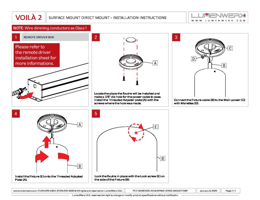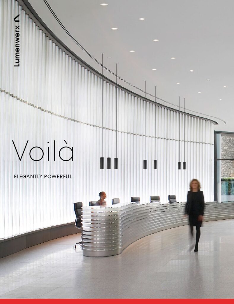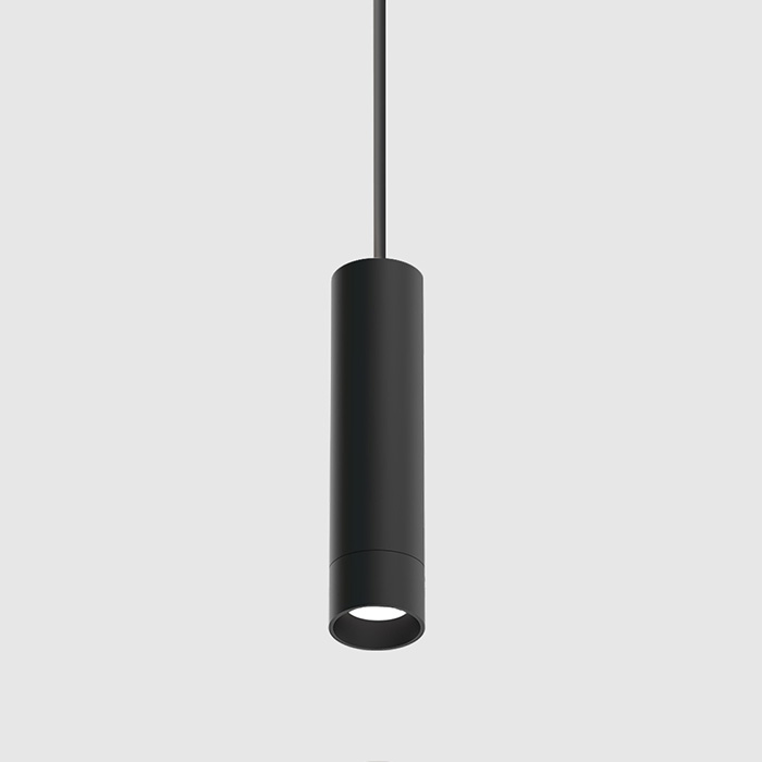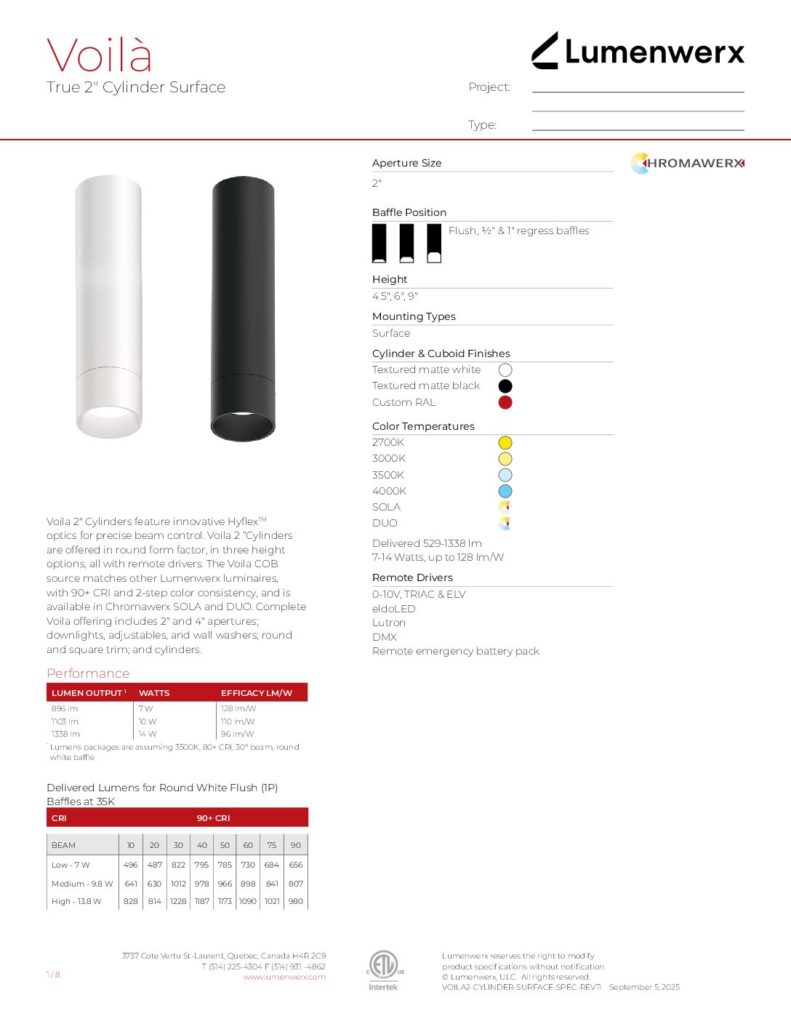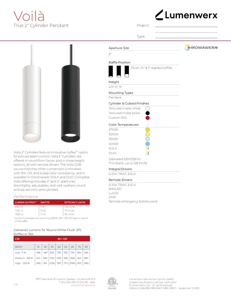 Voila 2″ cylinder downlights are available for pendant and surface installation with multiple finishes. Using HyFlex optics, field-interchangeable beam angles range from 10º to 90º. Drivers are remote and are available for Remote drivers are available 0-10V, ELV, Triac, DALI and various Lutron and Eldoled dimming protocols, as well as ChromaWerx Sola and Duo. Pendants can be suspended with PVC or fabric-covered cable. Surface cylinders can be powered by direct wire or through a J-box. Surface conduit adapters are available for both surface and pendant installation. Die-cast baffles are offered in in 0.5″, 1″ and 2″ depth and match the cylinder diameter. Pre-set luminaire light output is available from up to 1220 lumens.